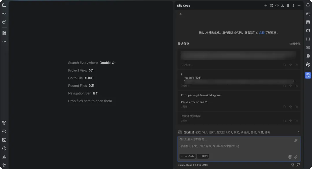Kilo Code 在 IDEA 中的使用方式和在 VS Code 中类似,配置方法基本一致,这里就不再重复截图演示了。