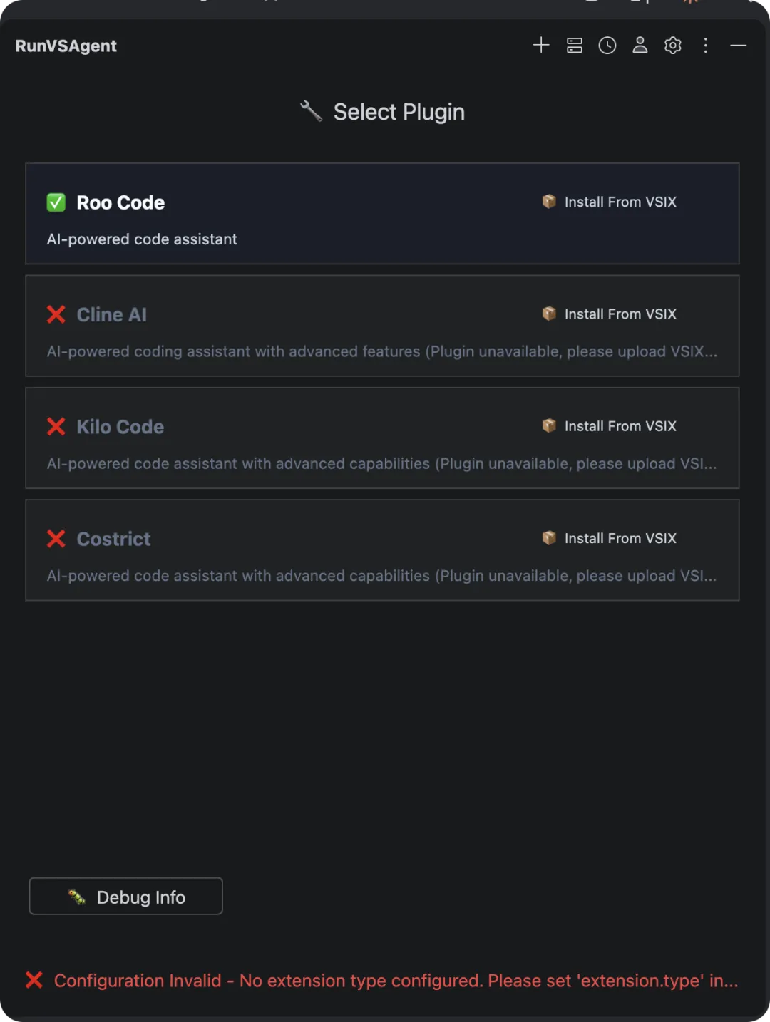 RunVSAgent 比较特殊,它本质上是在 IDEA 中运行 VS Code 的插件。安装 RunVSAgent 插件之后,可以在 IDEA 中安装 VS Code 的各种 AI 插件,默认已经安装了 Roo Code,可以直接使用。