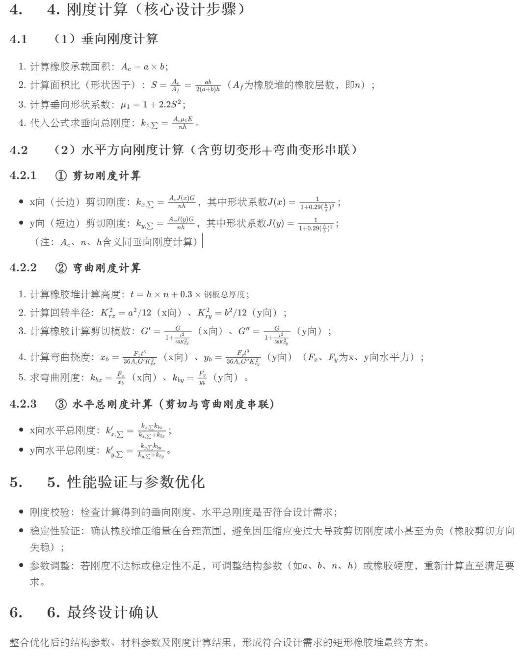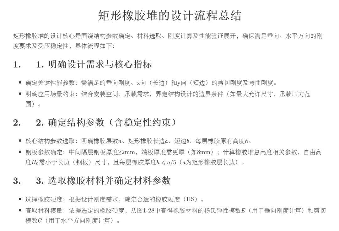 --- 橡胶材料属性计算 ---Successfully calculate the rubber property ! . 橡胶硬度 HS = 60 杨氏弹性模数 E = 6.05 MPa 剪切模数 G = 1.22 MPa--- 垂向刚度计算 --- 承载面积 Ac = 8000.00 mm² 形状因子 S = 2.2222 垂向形状系数 μ1 = 11.8642 杨氏弹性模数 E = 6.05 MPa 计算垂向刚度 Kz = 14353.07 N/mm--- 水平方向刚度计算 --- 剪切刚度计算: 剪切模数 G = 1.22 MPa x向剪切形状系数 Jx = 0.9971 x向剪切刚度 Kx_shear = 243.33 N/mm y向剪切形状系数 Jy = 0.9955 y向剪切刚度 Ky_shear = 242.94 N/mm 弯曲刚度计算: 计算高度 t = 46.60 mm x向回转半径 Krx = 28.87 mm y向回转半径 Kry = 23.09 mm x向计算剪切模数 G' = 1.14 MPa y向计算剪切模数 G'' = 1.10 MPa x向弯曲刚度 Kbx = 2698.57 N/mm y向弯曲刚度 Kby = 1663.91 N/mm x向水平总刚度 Kx = 223.21 N/mm y向水平总刚度 Ky = 211.99 N/mm--- 稳定性校核 --- 压缩应变: 5.62% 允许最大压缩应变: 15.00% h/a比值: 0.10 允许最大h/a比值: 0.20--- 刚度安全系数计算 --- 垂向刚度安全系数: 7.18 (要求: 1.00) x向水平刚度安全系数: 0.74 (要求: 1.00) y向水平刚度安全系数: 0.71 (要求: 1.00)========================================== 计算完成==================================================================================== 安全校核结果========================================== 发现 2 个警告: 警告 1: x向水平刚度安全系数 0.74 小于要求 1.00 警告 2: y向水平刚度安全系数 0.71 小于要求 1.00================================================================================== 计算结果汇总========================================橡胶承载面积 Ac = 8000.00 mm^2形状因子 S = 2.2222垂向形状系数 mu1 = 11.8642垂向刚度 Kz = 14353.07 N/mm (目标: 2000.00 N/mm)x向水平总刚度 Kx = 223.21 N/mm (目标: 300.00 N/mm)y向水平总刚度 Ky = 211.99 N/mm (目标: 300.00 N/mm)x向剪切刚度 = 243.33 N/mmy向剪切刚度 = 242.94 N/mmx向弯曲刚度 = 2698.57 N/mmy向弯曲刚度 = 1663.91 N/mm压缩应变 = 5.62%========================================