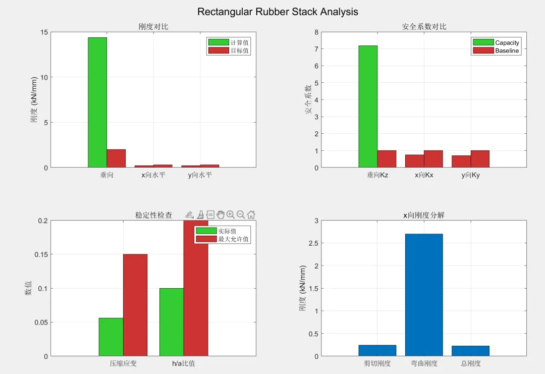 % 功能:% - 矩形橡胶堆垂向刚度计算% - 矩形橡胶堆水平方向刚度计算(剪切+弯曲)% - 形状系数和稳定性约束校核% - 刚度安全系数校核properties(Hidden, Constant)% Input 预期字段inputExpectedFields = {'Kz_target'% 目标垂向刚度 (N/mm)'Kx_target'% 目标x向水平总刚度 (N/mm)'Ky_target'% 目标y向水平总刚度 (N/mm)'Fz_max'% 最大垂向载荷 (N)'Fx_max'% 最大x向水平力 (N)'Fy_max'% 最大y向水平力 (N)'n'% 橡胶层数'a'% 矩形橡胶长边 (mm)'b'% 矩形橡胶短边 (mm)'h'% 每层橡胶原有高度 (mm)'t_plate_mid'% 中间隔层钢板厚度 (mm)'t_plate_end'% 端板厚度 (mm)'a_max'% 长边最大允许尺寸 (mm)'b_max'% 短边最大允许尺寸 (mm)};% Output 预期字段outputExpectedFields = {'Ac'% 橡胶承载面积 (mm²)'S'% 形状因子 (面积比)'mu1'% 垂向形状系数'Kz_calc'% 计算垂向总刚度 (N/mm)'Jx'% x向剪切形状系数'Jy'% y向剪切形状系数'Kx_shear'% x向剪切刚度 (N/mm)'Ky_shear'% y向剪切刚度 (N/mm)'t'% 橡胶堆计算高度 (mm)'Krx'% x向回转半径 (mm)'Kry'% y向回转半径 (mm)'G_prime'% x向橡胶计算剪切模数 (MPa)'G_double_prime'% y向橡胶计算剪切模数 (MPa)'xb'% x向弯曲挠度 (mm)'yb'% y向弯曲挠度 (mm)'Kbx'% x向弯曲刚度 (N/mm)'Kby'% y向弯曲刚度 (N/mm)'Kx_total'% x向水平总刚度 (N/mm)'Ky_total'% y向水平总刚度 (N/mm)'H0'% 橡胶堆自由高度 (mm)'compression_strain'% 压缩应变'Assembly'% FEM装配模型'RubberProperty'% 橡胶材料属性};% Params 预期字段paramsExpectedFields = {'HS'% 橡胶硬度'Material'% 平板材料属性'Name'% 矩形橡胶堆设计组件名称'Echo'% 是否输出计算过程};% Baseline 预期字段baselineExpectedFields = {'min_Kz_ratio'% 垂向刚度安全系数最低要求'min_Kx_ratio'% x向水平刚度安全系数最低要求'min_Ky_ratio'% y向水平刚度安全系数最低要求'max_compression_strain'% 最大允许压缩应变'max_h_to_a_ratio'% 最大h/a比值约束};% Params 默认值default_HS = 60; % 邵氏硬度default_Echo = 1;default_Material = [];default_Name = 'RectangularRubberStack_1'% Input 默认值input_default_n = 4; % 橡胶层数input_default_a = 100; % 长边 100mminput_default_b = 80; % 短边 80mminput_default_h = 10; % 每层高度 10mminput_default_t_plate_mid = 2; % 中间隔层钢板 2mminput_default_t_plate_end = 8; % 端板 8mm% Baseline 默认值base_min_Kz_ratio = 1.0;base_min_Kx_ratio = 1.0;base_min_Ky_ratio = 1.0;base_max_compression_strain = 0.15; % 最大压缩应变15%base_max_h_to_a_ratio = 0.2; % h <= a/5