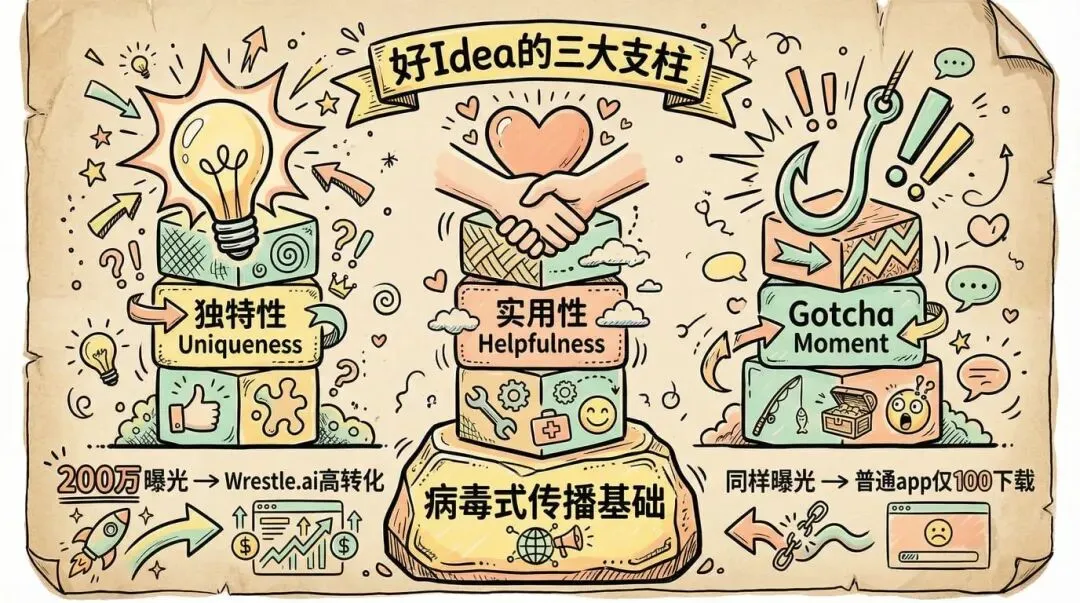 George 认为好 idea 有三个支柱:独特性、实用性、Gotcha Moment(钩子时刻)。