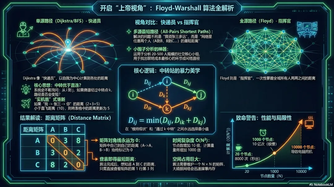 Floyd-Warshall 算法,它用一种极其“暴力”却优雅的方式,一次性填满整个网络的距离矩阵。