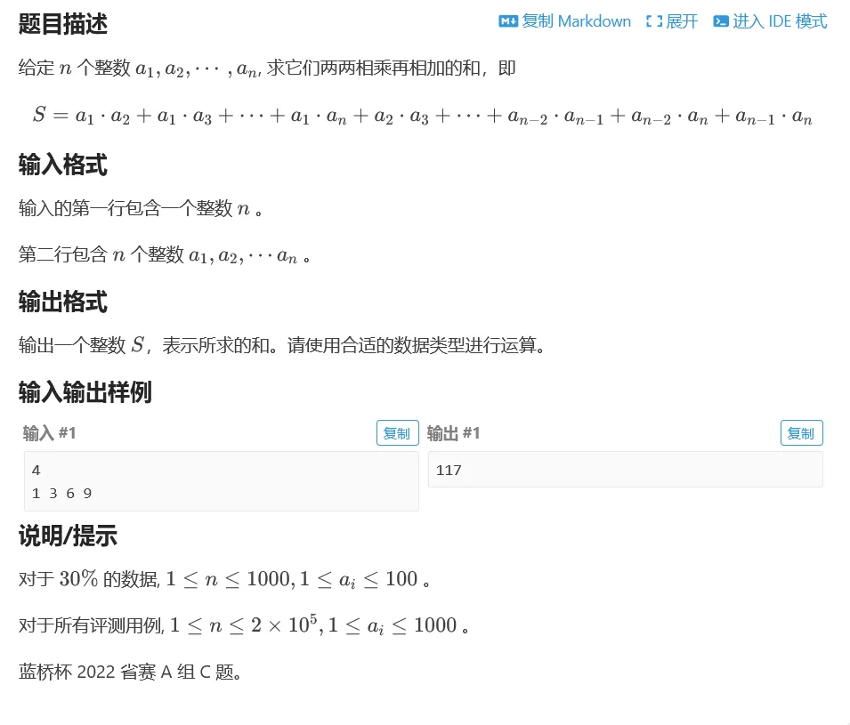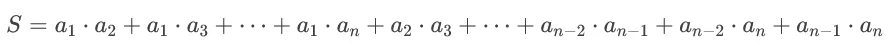 - 关键观察:`两两乘积和` 可以用 `(总和)² - 平方和` 间接推导,公式变形后时间复杂度直接降到 `O(n)`。