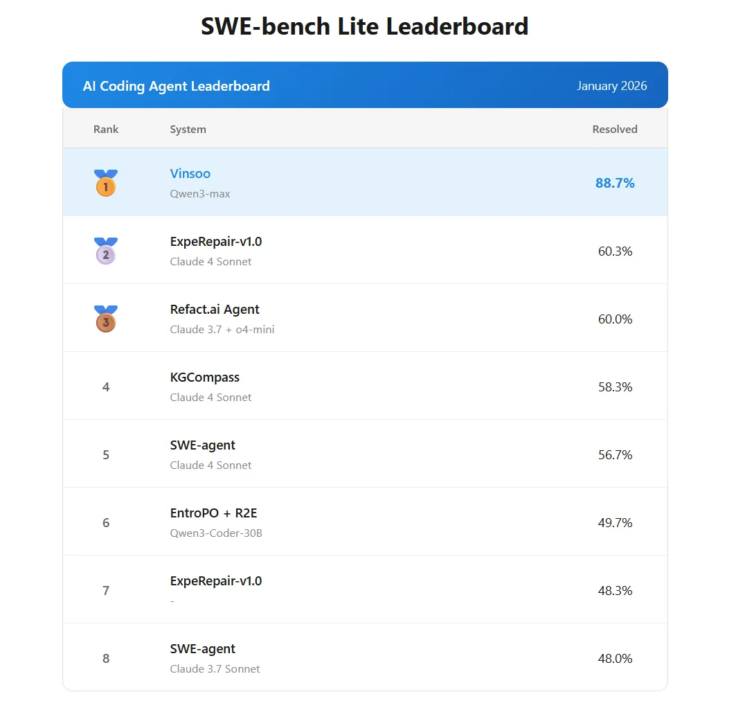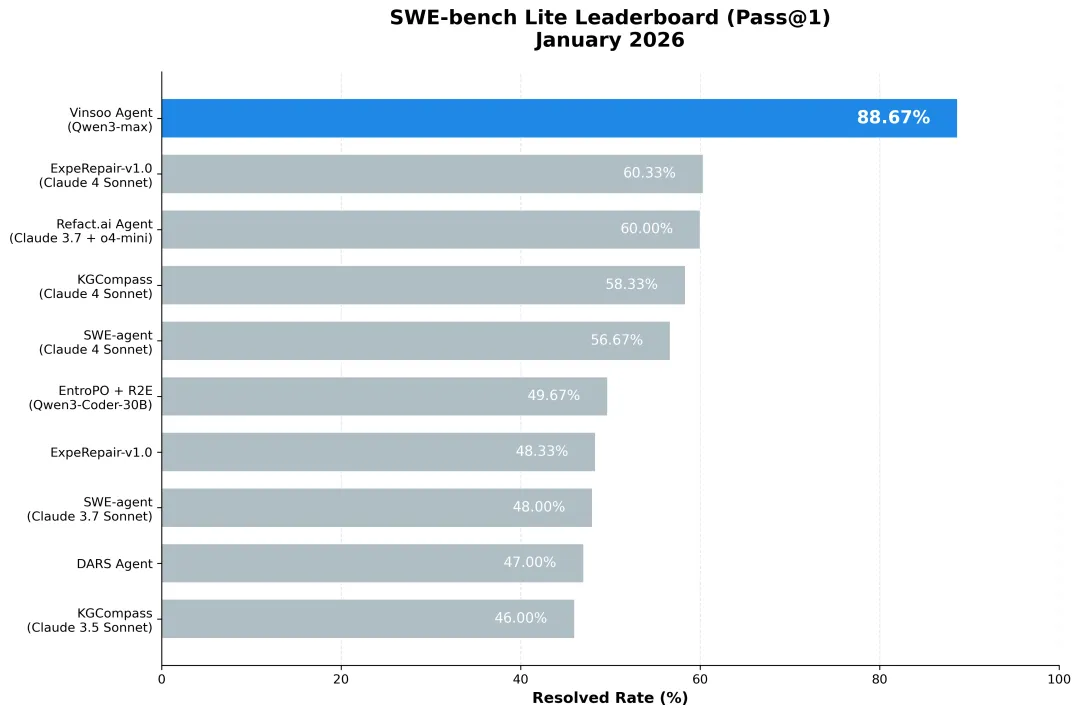 据了解,在近日即将发布的AI编程智能体榜单(SWE-bench 相关测评)中,其凭借自研的Vinsoo 3.0云端Agent,在没有任何人类干预的前提下,不仅大幅超越了硅谷的一众独角兽,更在复杂任务处理成功率上刷出了世界第一的SOTA效果。