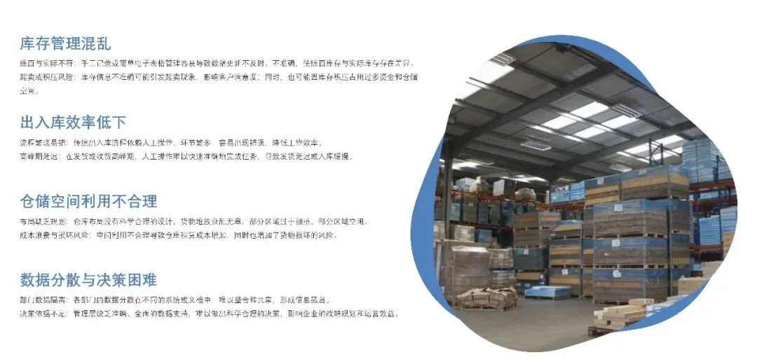 库存管理上,手工记录易漏记、错记,导致账实不符,引发超卖、积压风险并误导关联业务决策。出入库环节人工流程繁琐,高峰期易出现订单延误、货物流转差错。仓储空间布局缺乏规划,堆放杂乱,既浪费成本又增加货物损坏风险。此外,部门数据孤立形成信息孤岛,无法实时共享,制约管理层精准决策。