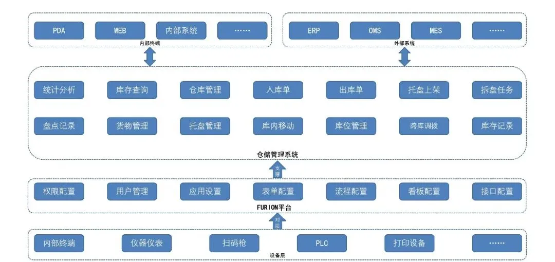 系统采用多层级架构设计,兼顾业务灵活性与未来扩展性,适配企业不同发展阶段的需求。多终端支持全面覆盖PDA手持设备、WEB管理端、企业内部ERP/OMS/MES等核心系统,同时可实现与外部第三方平台的无缝对接,确保全场景业务数据实时互通。核心功能层涵盖统计分析、库存实时查询、出入库单据管理、托盘精准上架、周期性盘点等核心业务模块,一站式满足仓储全流程运营需求。底层由FURION低代码平台提供坚实支撑,可灵活实现权限精细化配置、业务流程自定义编排、多系统接口快速集成等基础能力,显著降低系统搭建、迭代与维护成本。核心功能亮点