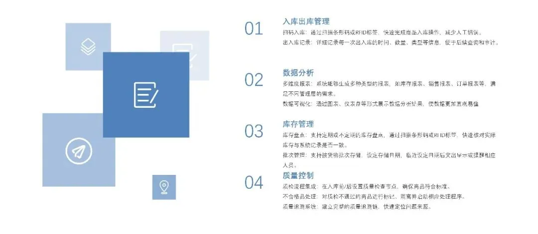 出入库管理采用扫码操作替代人工记录,自动捕捉关键信息,减少失误并实现全环节可追溯。数据分析模块可生成多维度报表,搭配可视化展示,助力快速挖掘数据价值。库存管理支持多种盘点模式与完善批次管理,临近到期自动提醒,规避库存风险。质量控制集成全流程质检,隔离处理不合格品并建立追溯链,保障交付质量。