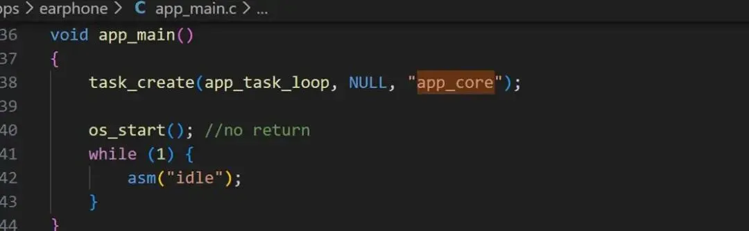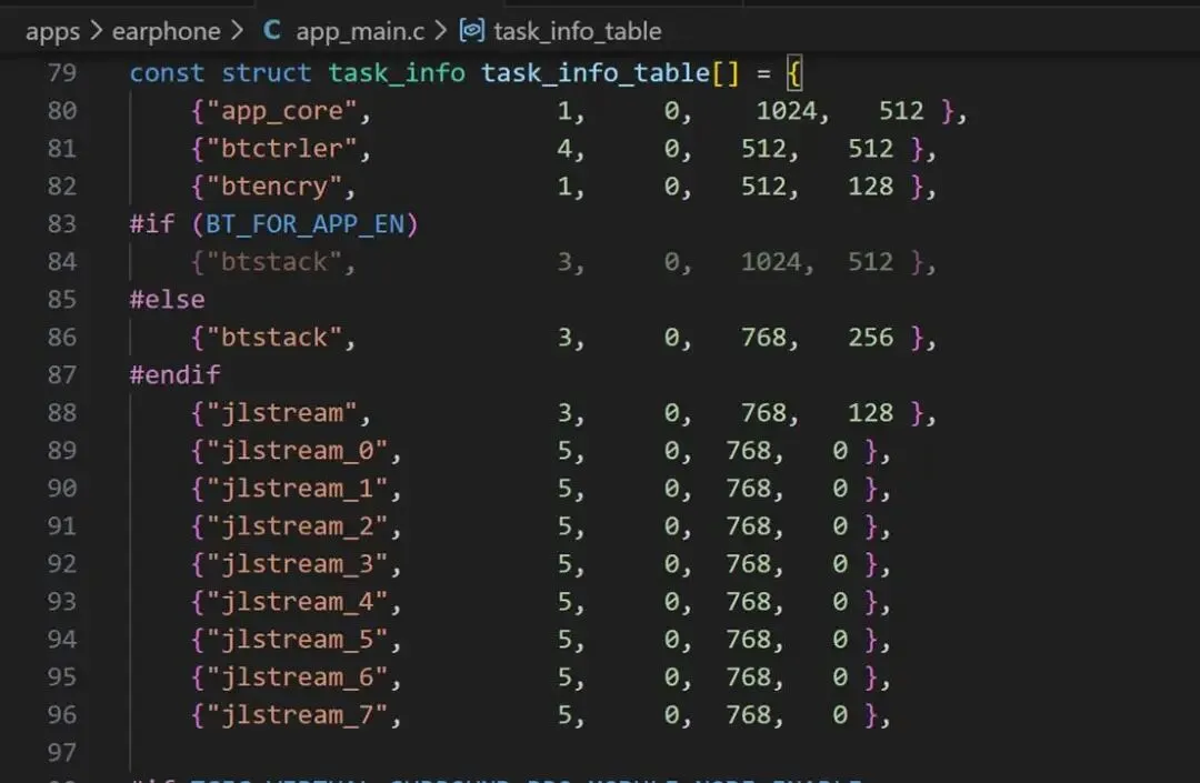 这里以最常用的“app_core”任务为例,这可以认为是杰理SDK的主任务,在开机启动的时候便会调用OS API中的创建任务函数task_create()来创建“app_core”任务,如下图