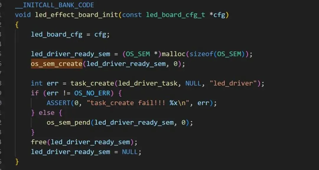 如下为杰理SDK一个的应用举例:app_core任务中led驱动初始化时使用了信号量,使用OS API提供的信号量创建函数os_sem_create()创建了一个led_driver_ready_sem的信号量。
