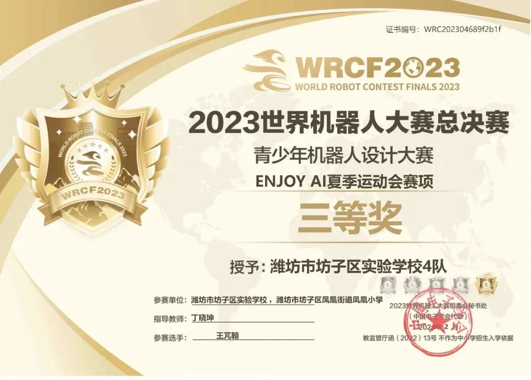 - 2023世界机器人大赛山东省选拔赛上,与队友组成的战队势如破竹拿下一等奖,成功晋级全球总决赛;