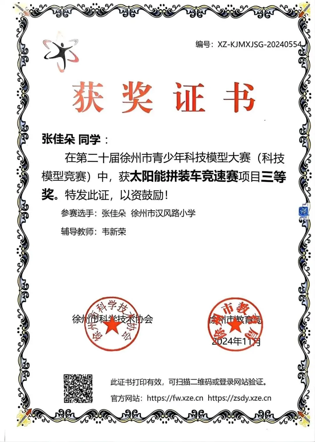 第二十届徐州市青少年科技模型大赛三等奖