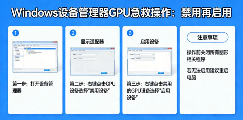 - 右键点击开始菜单,选择“设备管理器”,找到“显示适配器”,右键点击无法识别的GPU设备,选择“禁用设备”,等待10秒后,再右键选择“启用设备”;