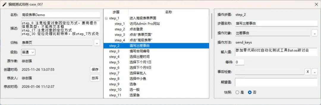 想象一下:当下一个版本发布时,你只需在对象库更新几处定位,所有用例即刻恢复运行;当业务同事提出新场景,你在可视化界面拖拽几下就能生成用例——这种敏捷与从容,正是Baton 想带给每一位测试人的日常。