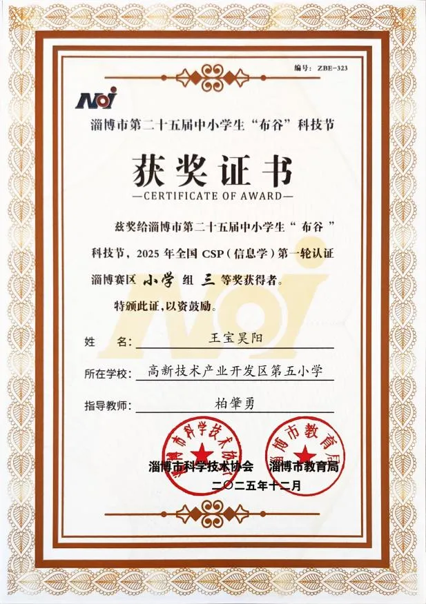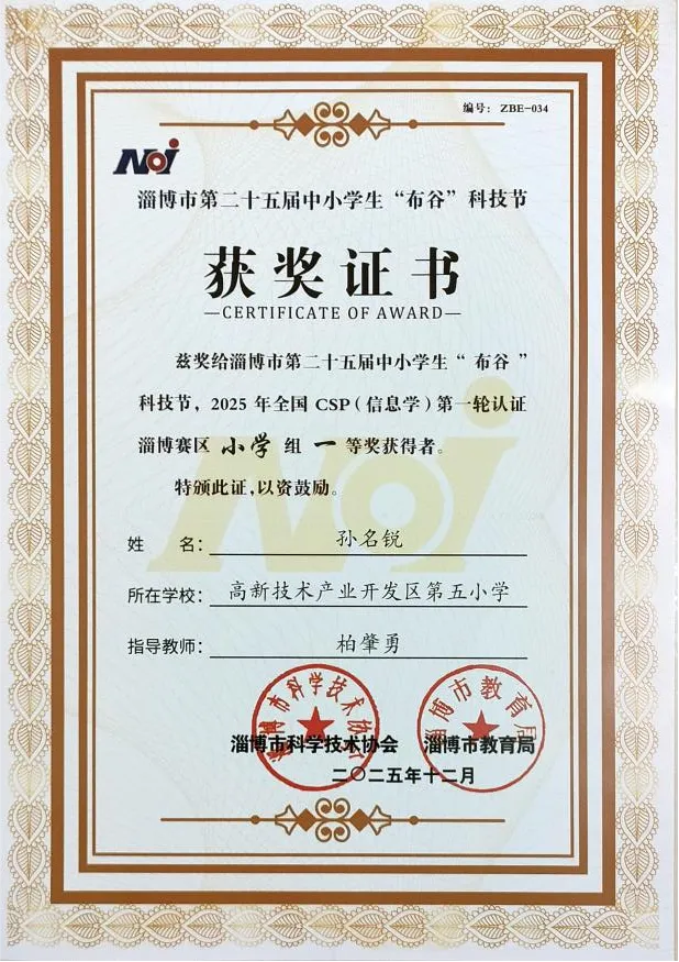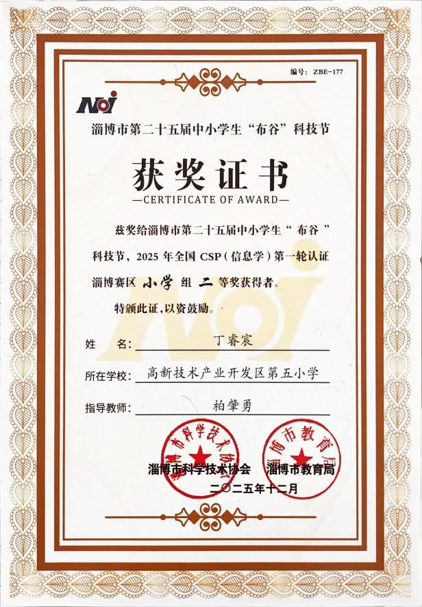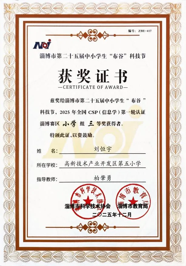 全国青少年信息学奥林匹克竞赛作为教育部认可的五大学科竞赛之一,由中国计算机学会统一组织,以其高含金量、强挑战性成为选拔青少年信息科技人才的重要平台。最终,经过多轮严苛比拼,我校学子凭借稳定的发挥脱颖而出,共斩获小学组一等奖1名、二等奖1名、三等奖2名,充分彰显了五小学子在信息科技领域的强劲实力。