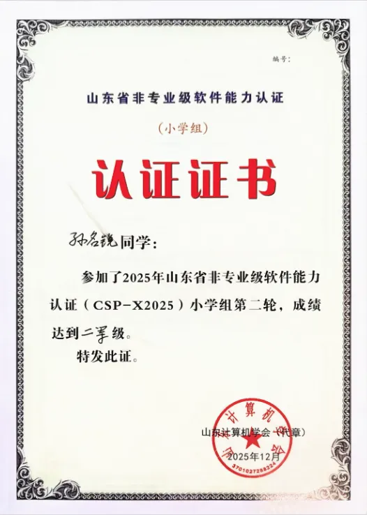 同时我校孙名锐同学进入2025年全国青少年信息学奥林匹克竞赛(NOI)省级赛区(复赛)并取得优异成绩。我校孙名锐同学凭借扎实的算法功底、出色的逻辑思维能力和稳定的临场发挥,在激烈的竞争中脱颖而出,荣获省级赛区二等奖的优异成绩。优异成绩的背后,是学子们的勤学不辍,更是学校深耕信息学教育、践行素质教育理念的生动体现。近年来,高新区第五小学高度重视科技创新教育,将信息学素养培养纳入特色育人体系,为热爱编程的学子搭建了全方位的成长平台。代码筑梦,未来可期。高新区第五小学此次在信息学奥赛中的亮眼表现,是学校特色教育成果的又一次集中展现。相信在优质教育生态的滋养下,五小学子将继续以热爱为帆、以坚持为桨,在科技创新的浪潮中勇攀高峰,书写更多精彩篇章!