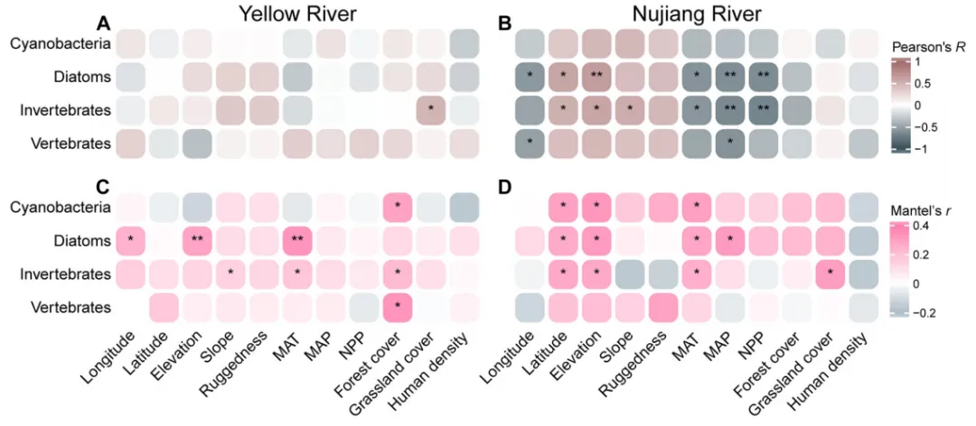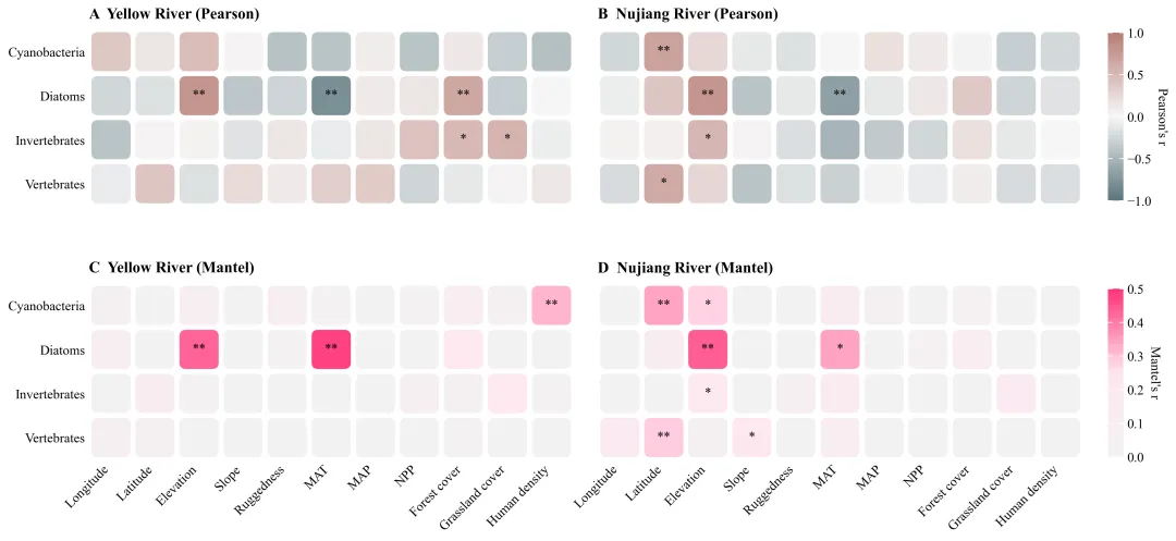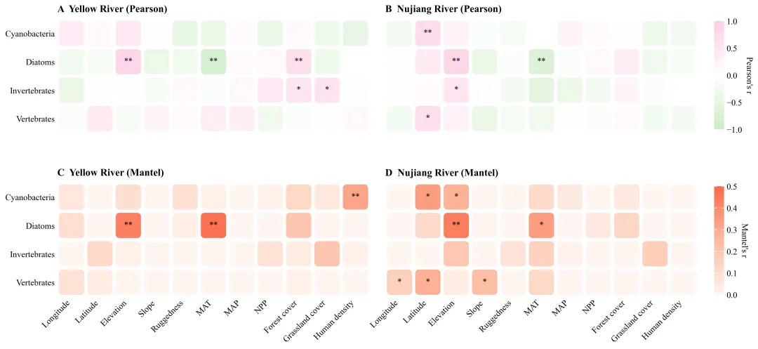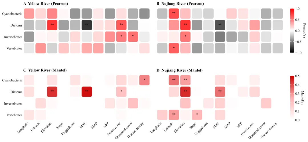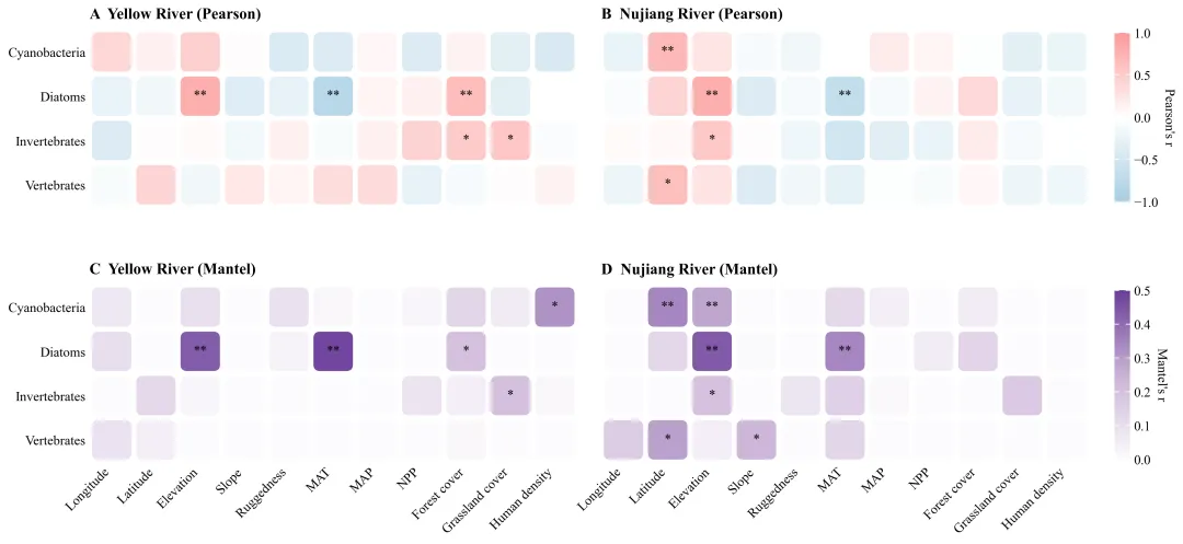 if __name__ == "__main__":file_path = r"data.xlsx" #数据路径# 读取数据yr_env = pd.read_excel(file_path, sheet_name="YR_Env", index_col=0)# 执行皮尔逊分析r_a, p_a = perform_pearson_analysis(yr_env, yr_bio)r_b, p_b = perform_pearson_analysis(nj_env, nj_bio)# 执行Mantel分析r_c, p_c = perform_mantel_analysis(yr_env, yr_bio)r_d, p_d = perform_mantel_analysis(nj_env, nj_bio)main_plot(results, draw_path) # 调用主绘图函数