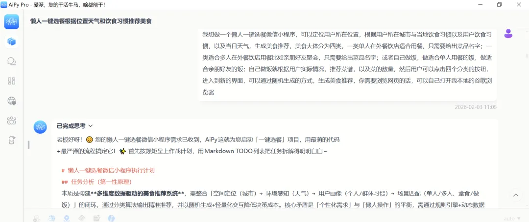 下面就是我让AiPy开发的“懒人一键选餐”小程序,功能实用又贴心: