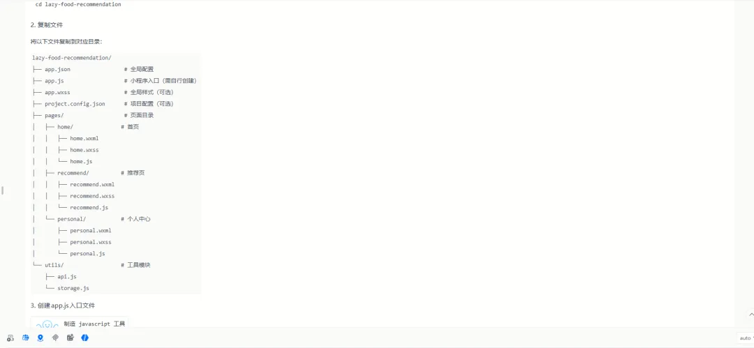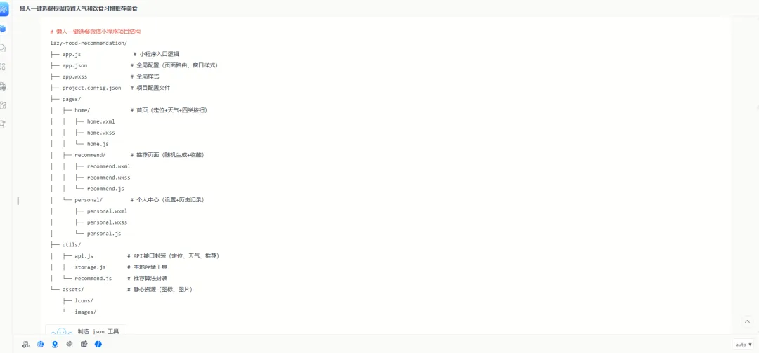 比如“我想做一个懒人一键选餐微信小程序,可以定位用户所在位置,根据用户所在城市与当地饮食习惯以及用户饮食习惯,以及当日天气,生成美食推荐,美食大体分为四类,一类单人在外餐饮店适合用餐,只需要给出菜品名字;一类适合多人在外餐饮店用餐比如亲朋好友聚会,只需要给出菜品名字;或者自己做饭,做适合单人用餐的饭,做适合亲朋好友的饭;自己做饭就根据用户实际情况,推荐菜谱,以及菜的数量,然后用户可以点击四个分类的按钮,进入到新的界面,可以通过随机生成的方式,生成美食推荐,你需要浏览网页的话,可以自己打开我本地的谷歌浏览器”