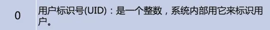 ① UID:一般情况下它与用户名是对应的。如果几个用户名对应的用户标识号是一样的,系统内部将把它们视为同一个用户,但是它们可以有不同的口令、不同的主目录以及不同的登录ShelI等。取值范围是0-65535。0是超级用户root的标识号,1-99由系统保留,作为管理账号,普通用户的标识号从100开始。在Linux系统中,这个界限是500。