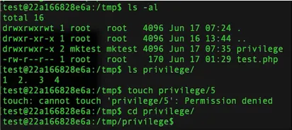 在拥有 R 权限的情况下,用户可以查看目录内容,但无法通过 touch 等命令在目录中创建新文件,操作会返回 “Permission denied”。不过,用户仍可以正常进入该目录。