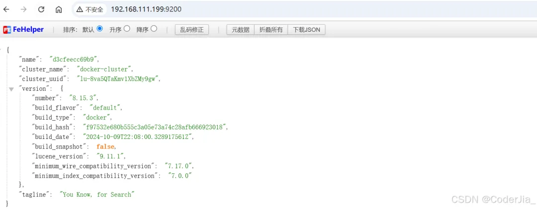 你可以通过在浏览器中输入 http://<你的服务器IP>:9200 来测试是否能够正常访问 Elasticsearch。如果配置正确,你应该能看到如下 Elasticsearch 的欢迎页面。