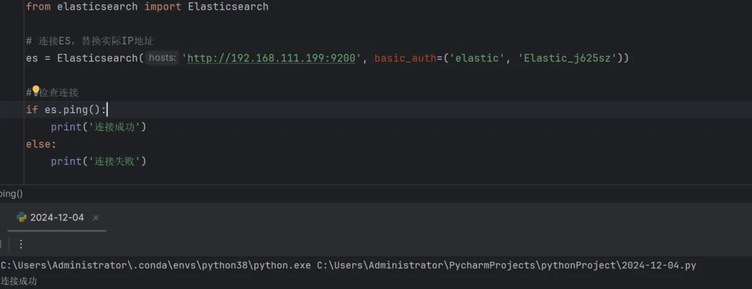 from elasticsearch import Elasticsearch# 连接到 Elasticsearch,替换为实际的 IP 地址和密码es = Elasticsearch('http://192.168.111.199:9200', basic_auth=('elastic', 'Elastic_j625sz'))# 检查连接if es.ping(): print('连接成功')else: print('连接失败')