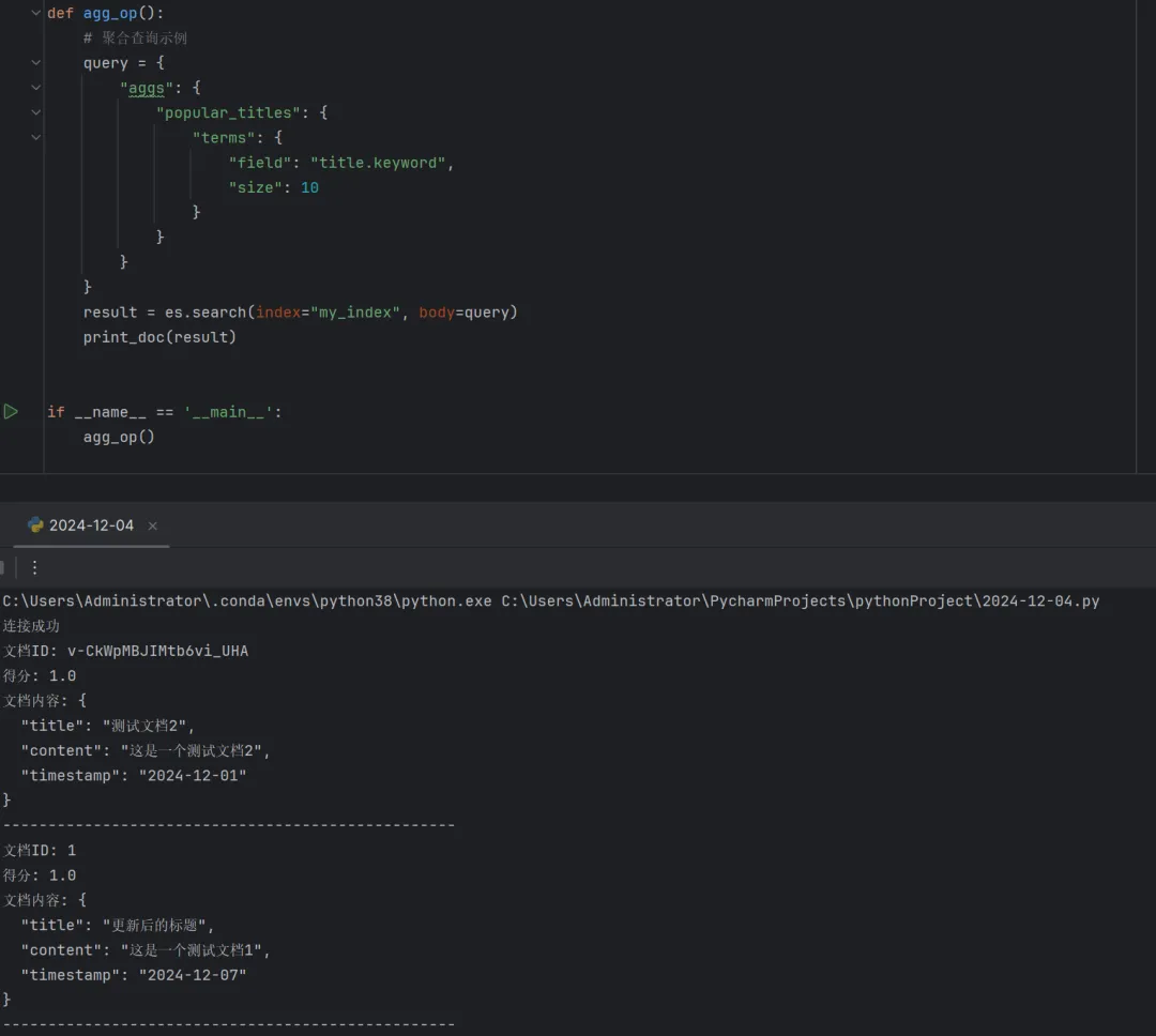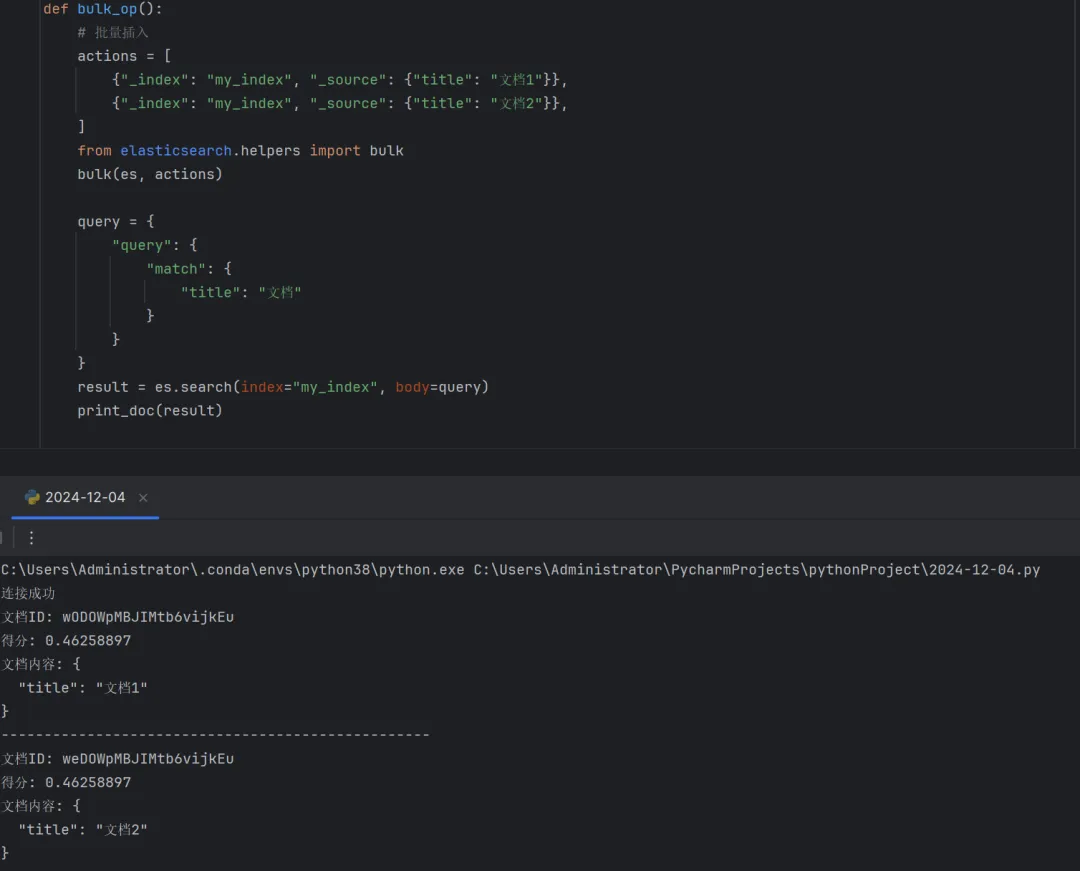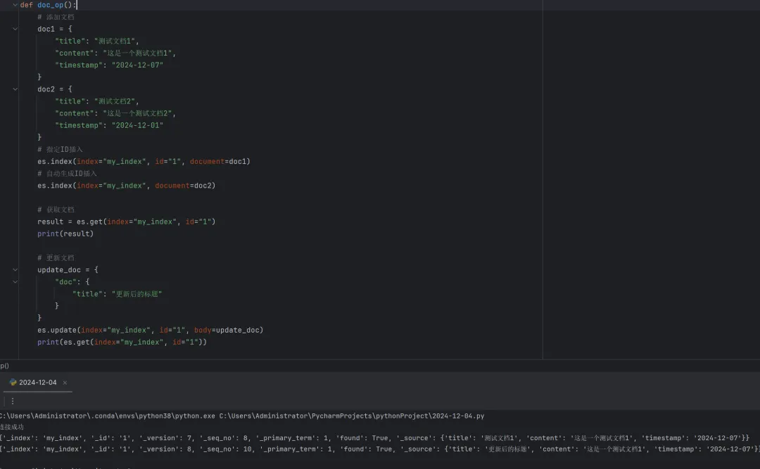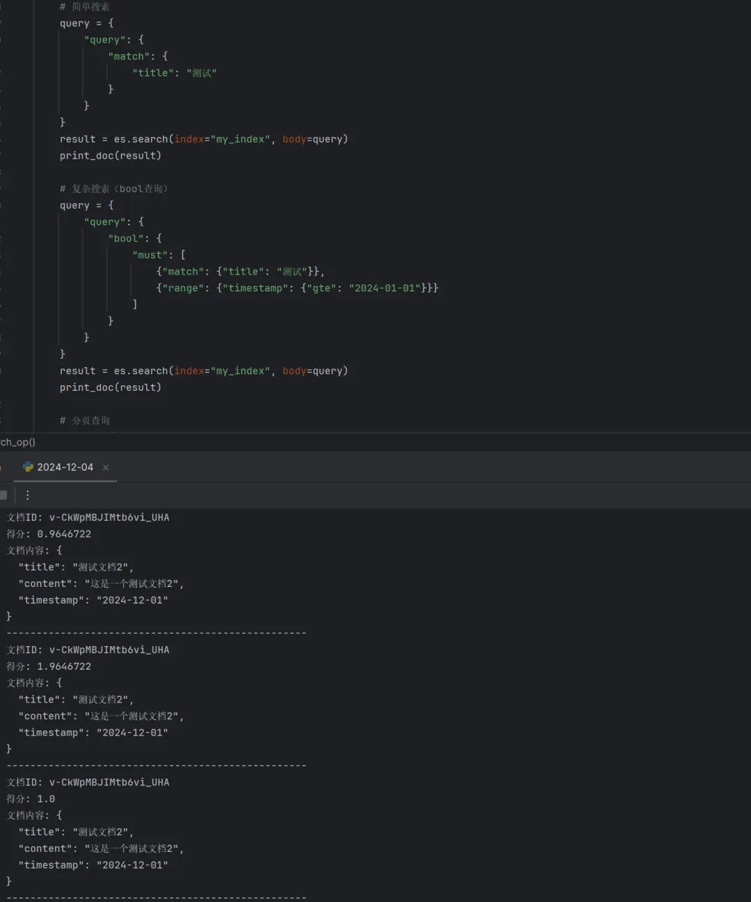 # 添加文档 doc1 = { "title": "测试文档1", "content": "这是一个测试文档1", "timestamp": "2024-12-07" } doc2 = { "title": "测试文档2", "content": "这是一个测试文档2", "timestamp": "2024-12-01" } # 指定ID插入 es.index(index="my_index", id="1", document=doc1) # 自动生成ID插入 es.index(index="my_index", document=doc2) # 获取文档 result = es.get(index="my_index", id="1") print(result) # 更新文档 update_doc = { "doc": { "title": "更新后的标题" } } es.update(index="my_index", id="1", body=update_doc) print(es.get(index="my_index", id="1")) # 删除文档 es.delete(index="my_index", id="1")
