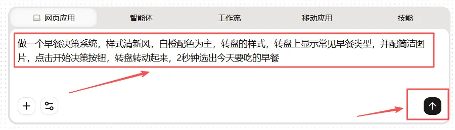 这个AI工具可以做网页、移动应用等,以网页举例,点击【网页应用】进入,开始输入想做的软件描述。