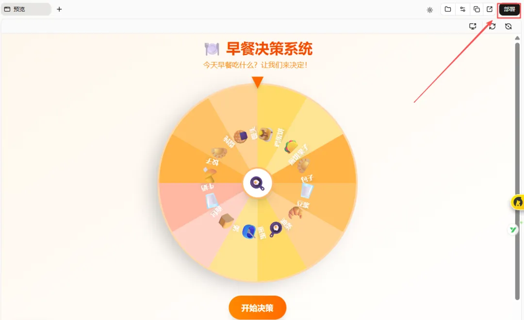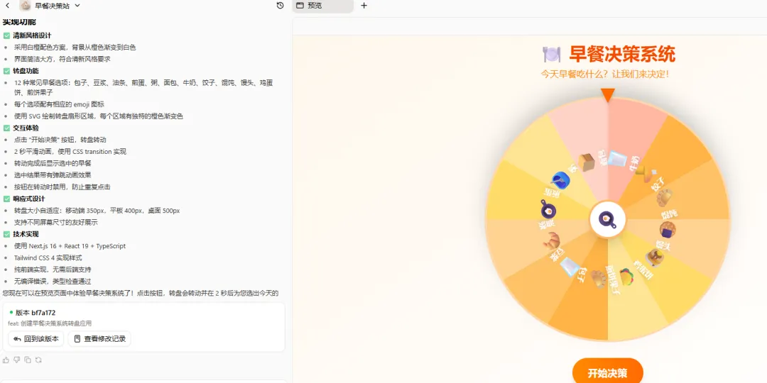 "做一个早餐决策系统,样式清新风,白橙配色为主,转盘的样式,转盘上显示常见早餐类型,并配简洁图片,点击开始决策按钮,转盘转动起来,2秒钟选出今天要吃的早餐"。