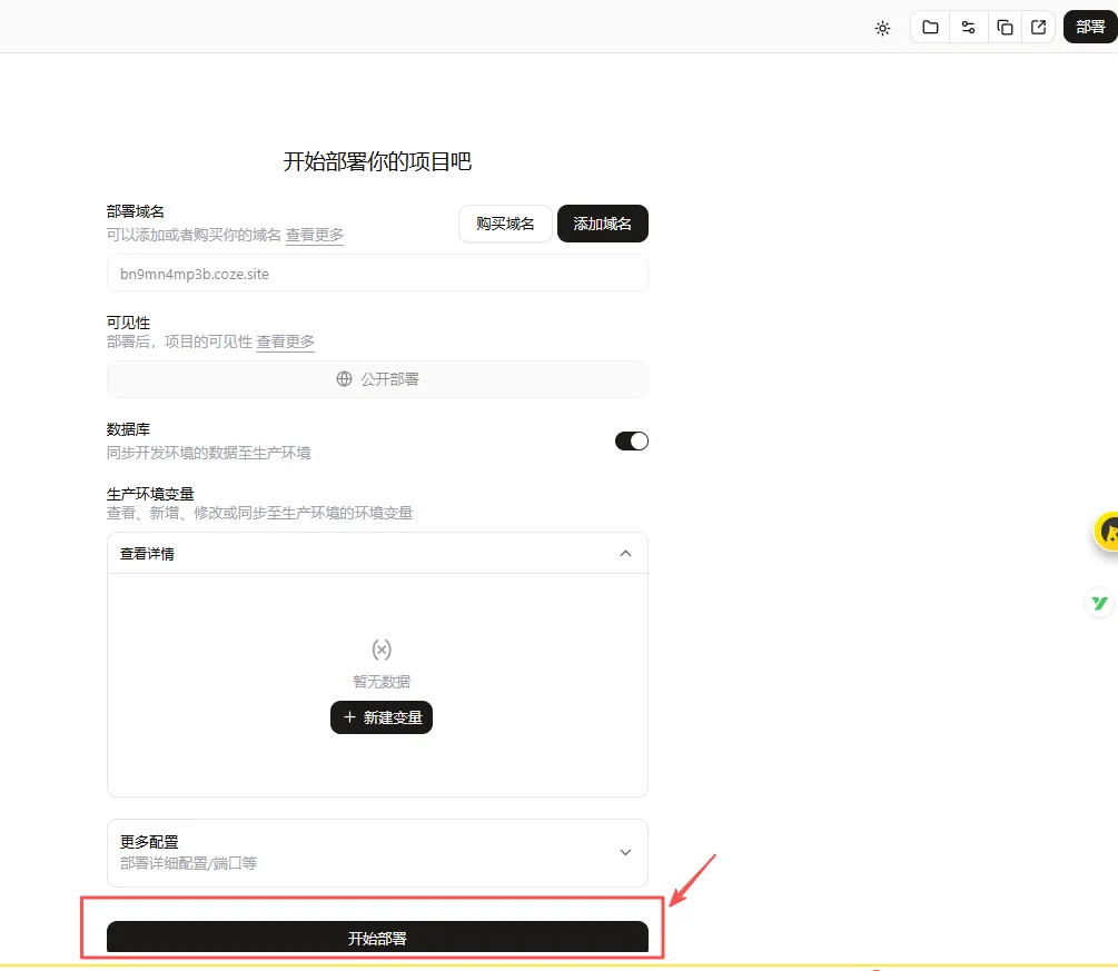可以发布到自己的域名,没有的话网站也配置了默认域名,直接点击【开始部署】即可,都是自动化的。