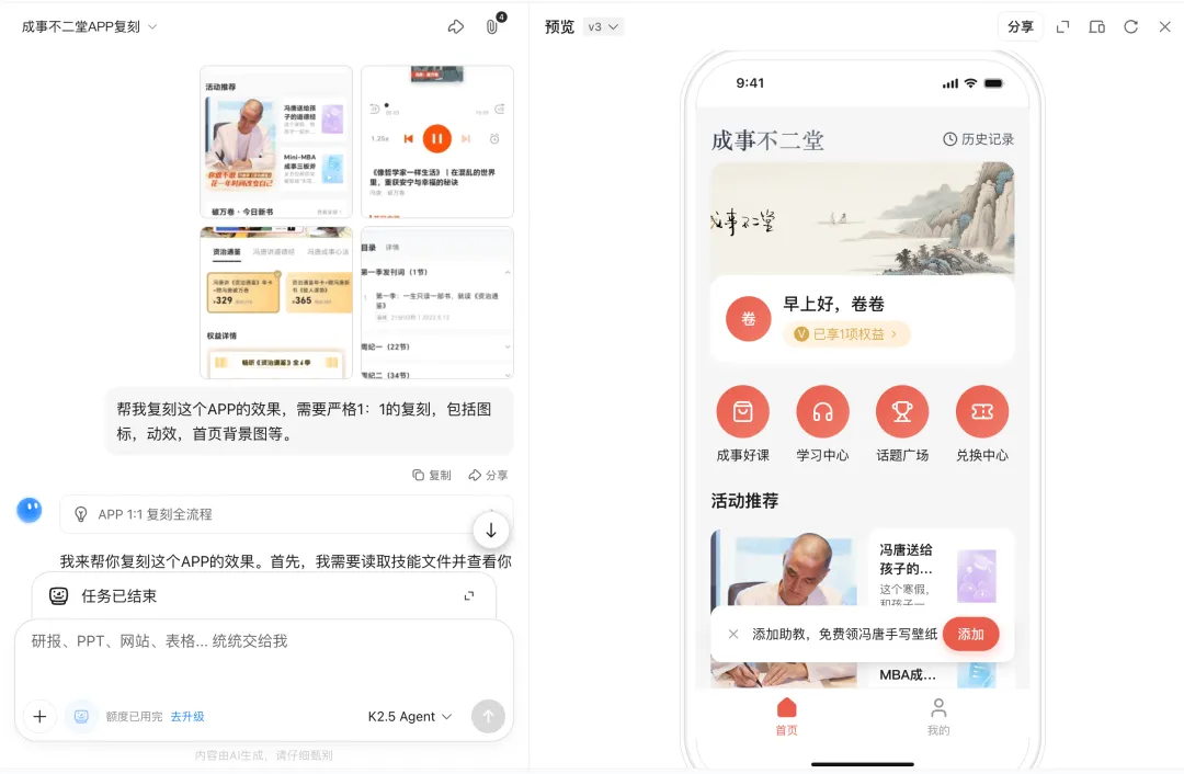就在前几天,Kimi 出了个新版本 K2.5,搞了个叫“视觉编程”的能力。你给它录个操作视频,它能看懂视频里面的交互逻辑,然后照着做出一个一模一样的来。要说这事以前应该只有 Google 的 Gemini 3 Pro 才能做到,想不到,现在咱们国产 Kimi 也行了。真能有这么牛吗,视频编程?那我得试试看到底是怎么个事儿。我给它提供了成事不二堂APP的四个核心页面,其中首页页头采用了极具中国风韵味的背景图设计,整体格调透着一股雅致的文人气息,我很喜欢这个气质。帮我复刻这个APP的效果,需要严格1:1的复刻,包括图标,动效,首页背景图等。