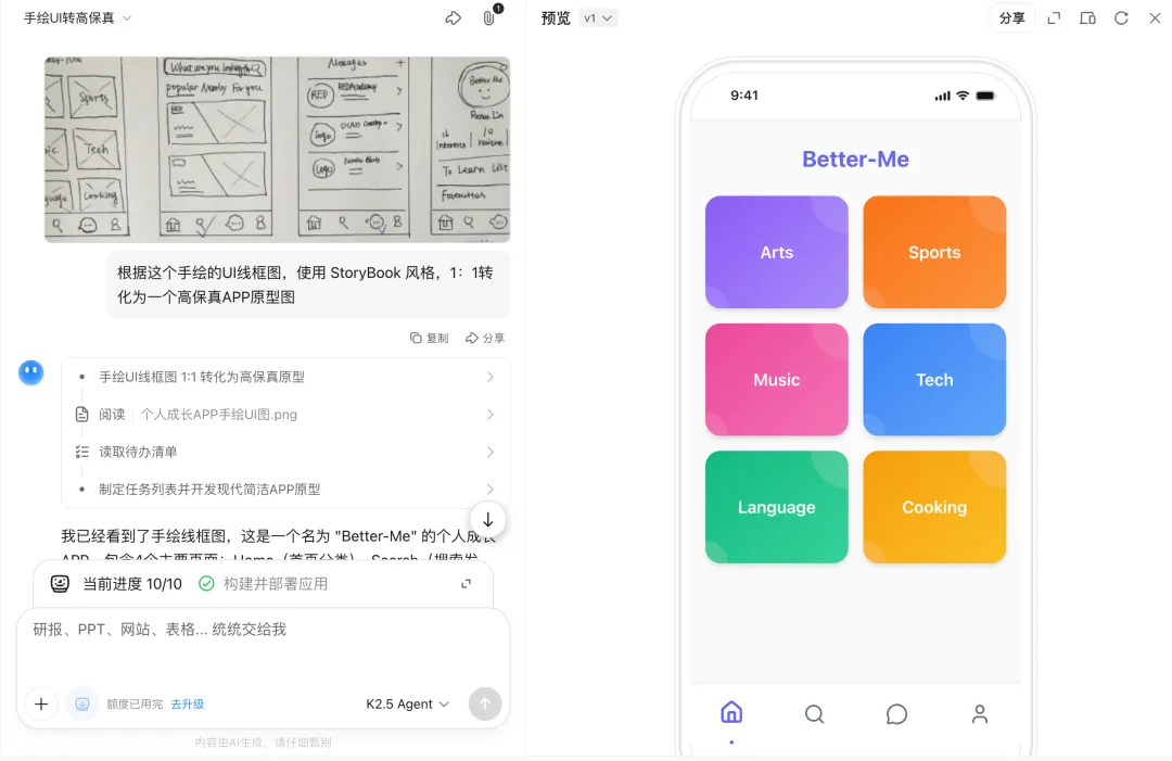 效果之所以能这么炸裂,全靠的是它能看懂原图的风格,直接识别并提取关键图片资源,同时还能调用AI画出相同的素材,然后就把一张图直接变成了能点能用的交互界面,这波操作真的是太顶了!https://txhh3vncimkh2.ok.kimi.link这次我上点儿难度,找了一个手绘的产品线框图,让它复刻一把,看能做成什么样。根据这个手绘的UI线框图,使用 StoryBook 风格,1:1转化为一个高保真APP原型图