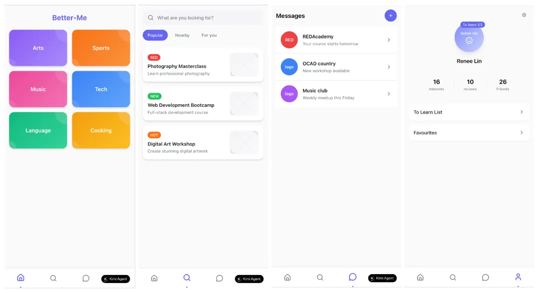 生成效果让我非常满意,一次性6个页面都生成了,功能也都对,试了下页面之间的跳转正常,tab切换ok,风格也对味儿,并且这还是一把生成的结果。如果哪不满意,继续精调下去,会更完美的。体验链接: