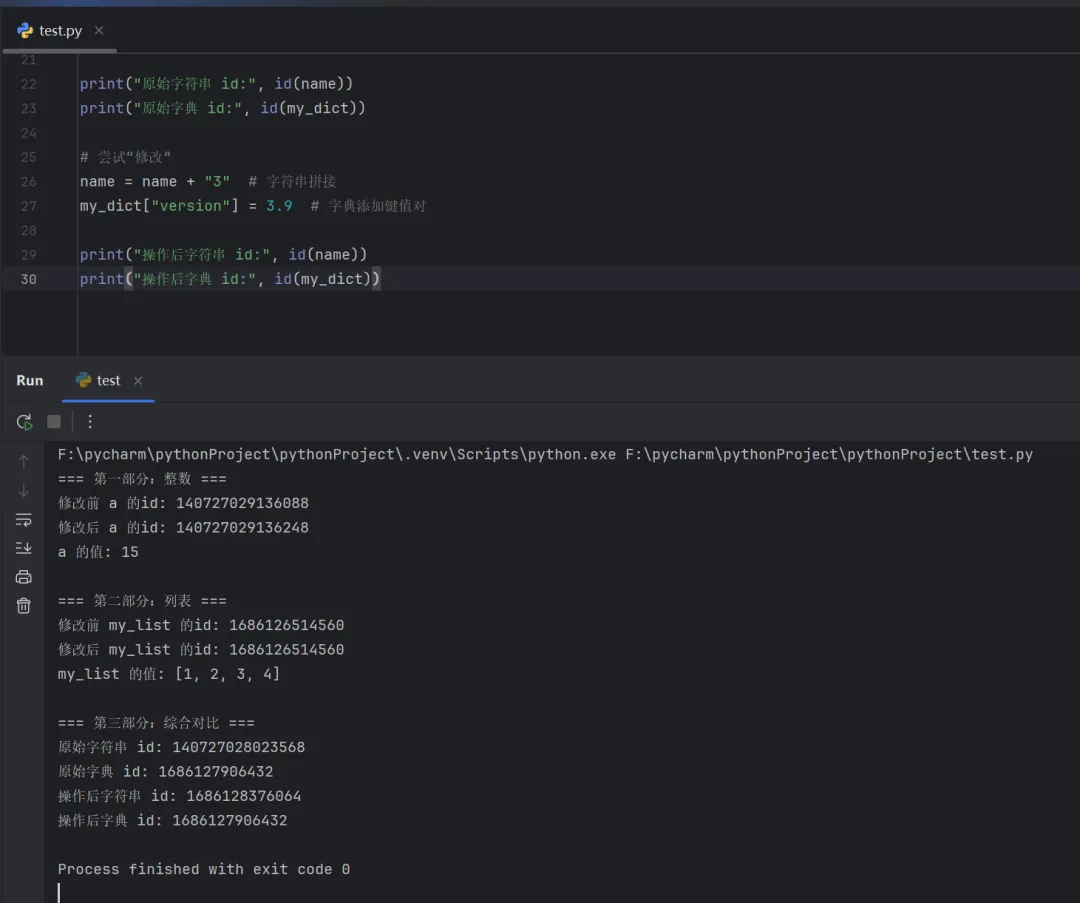 # 1. 不可变类型示例:整数 (int)print("=== 第一部分:整数 ===")a = 10print("修改前 a 的id:", id(a))a = a + 5print("修改后 a 的id:", id(a))print("a 的值:", a)# 2. 可变类型示例:列表 (list)print("\n=== 第二部分:列表 ===")my_list = [1, 2, 3]print("修改前 my_list 的id:", id(my_list))my_list.append(4)print("修改后 my_list 的id:", id(my_list))print("my_list 的值:", my_list)# 3. 综合对比:字符串(不可变)和字典(可变)print("\n=== 第三部分:综合对比 ===")name = "Python"my_dict = {"level": "easy"}print("原始字符串 id:", id(name))print("原始字典 id:", id(my_dict))# 尝试“修改”name = name + "3" # 字符串拼接my_dict["version"] = 3.9 # 字典添加键值对print("操作后字符串 id:", id(name))print("操作后字典 id:", id(my_dict))