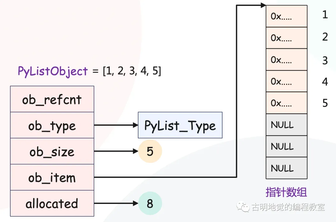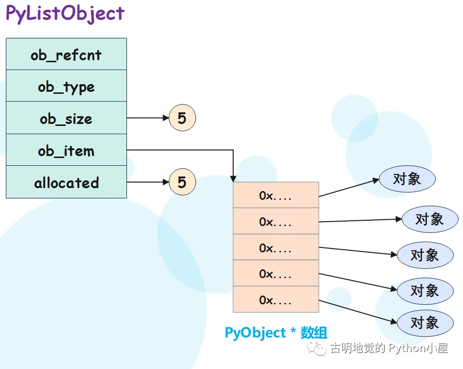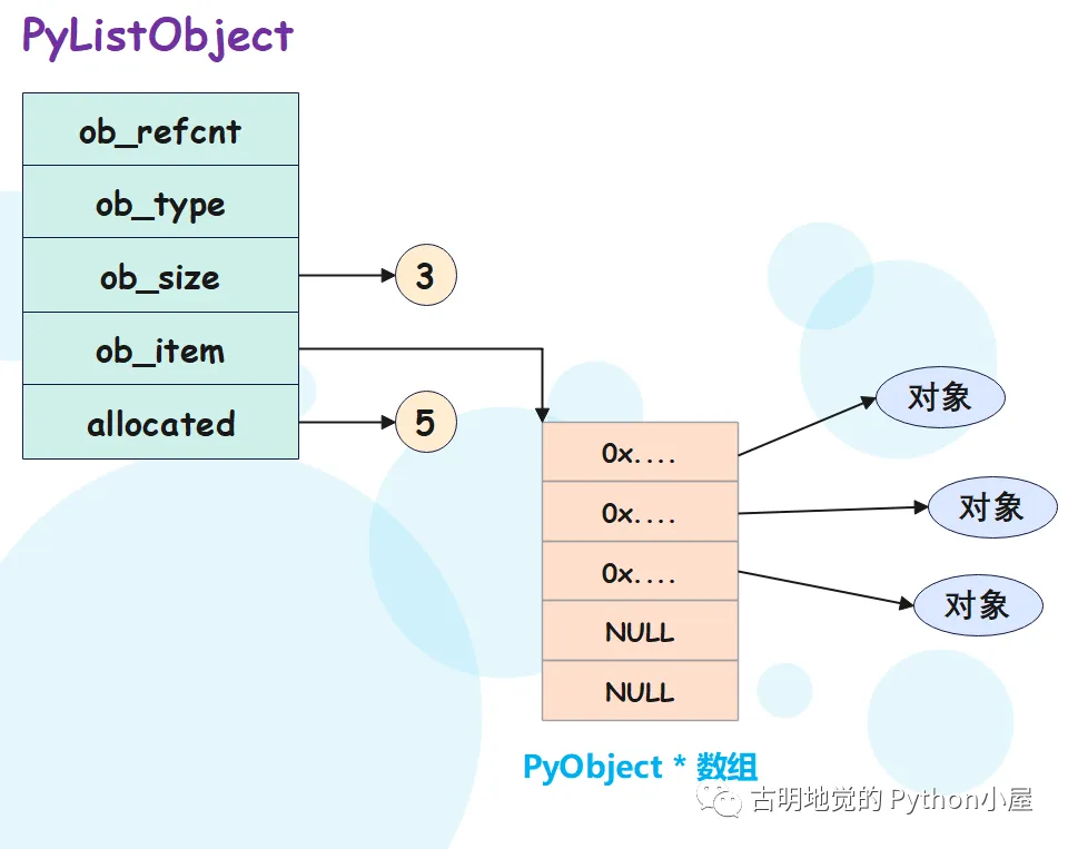 typedefstruct { PyObject_VAR_HEAD PyObject **ob_item; Py_ssize_t allocated;} PyListObject;我们看到里面有如下成员: