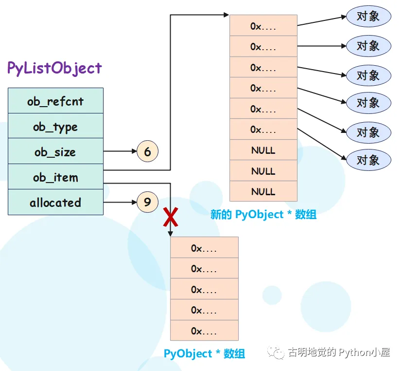 而申请的新的底层数组长度是9,那么说明列表的容量就变成了 9。然后将原来数组中的 PyObject * 按照顺序依次拷贝到新的数组里面,并让 ob_item 指向新的数组。然后将新元素设置在新数组中索引为 ob_size 的位置、即索引为 5 的位置,再将 ob_size 加 1(此时 ob_size 变成了 6)。