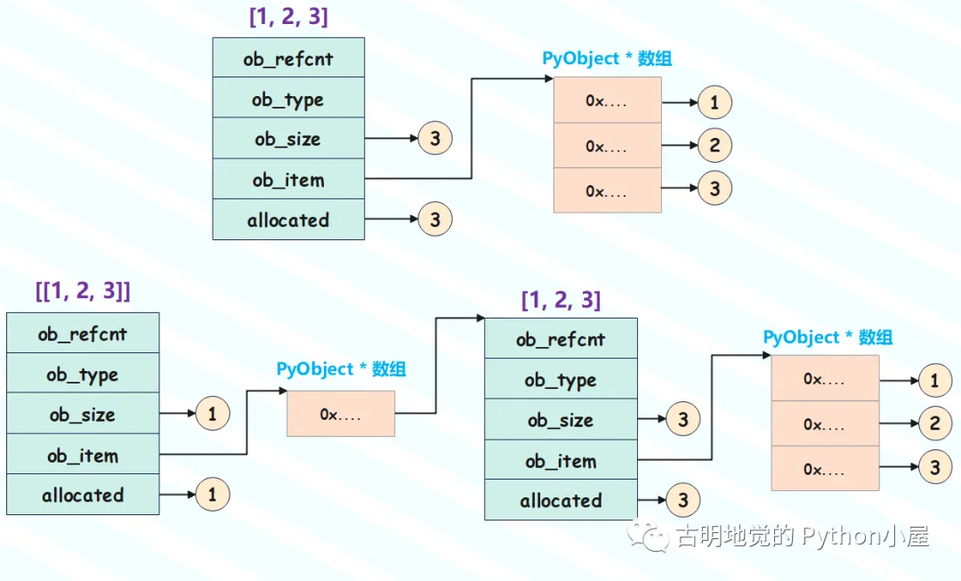 print([1, 2, 3].__sizeof__()) # 64print([[1, 2, 3]].__sizeof__()) # 48相信上面这个结果,你肯定能分析出原因。因为第一个列表中有3个指针,所以大小是40 + 24 = 64;而第二个列表中有一个指针,所以是40 + 8 = 48。用一张图来展示一下[1, 2, 3]和[[1, 2, 3]]的底层结构,看看它们之间的区别: