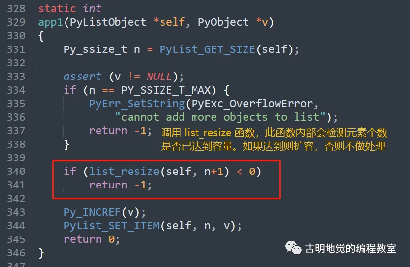 static PyObject *list_append(PyListObject *self, PyObject *object){ //显然调用的app1是核心, 它里面实现了添加元素的逻辑//Py_RETURN_NONE是一个宏,表示返回Python中的None//因为list.append返回的就是Noneif (app1(self, object) == 0) Py_RETURN_NONE;returnNULL;}staticintapp1(PyListObject *self, PyObject *v){ //参数self是列表,v是要添加的元素//获取列表的长度 Py_ssize_t n = PyList_GET_SIZE(self);//......//因为v作为了列表的一个元素,所以其指向的对象的引用计数要加1 Py_INCREF(v);//设置元素,原来的列表长度为n,最大索引是n - 1//那么追加的话就等于将元素设置在索引为n的地方 PyList_SET_ITEM(self, n, v);return0;}以上就是 append 的逻辑,所谓插入、追加本质上都是先计算出索引,然后再通过索引设置元素。