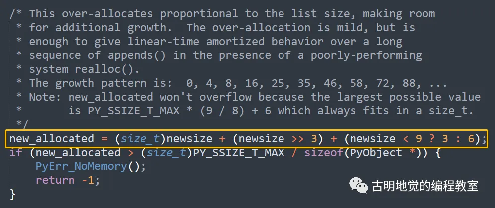 lst = [0] * 1000# 长度和容量一致print(len(lst))print((lst.__sizeof__() - 40) // 8)"""10001000"""# 再必须提一下# 扩容是当解释器在添加元素时,发现容量不够的时候才会扩容# 而使用 lst = [...] 这种方式创建的列表# 其大小和容量是相等的# 但此时添加一个元素的话, 那么ob_size会变成1001,大于容量1000# 所以此时列表就要扩容了, 执行 list_resize# (size_t)newsize + (newsize >> 3) + (newsize < 9 ? 3 : 6);# 显然 newsize 就是 1001print(1001 + (1001 >> 3) + (3if1001 < 9else6)) # 1132# append一个元素,列表扩容lst.append(123)print((lst.__sizeof__() - 40) // 8) # 1132结果是一样的,因为底层就是这么实现的,所以结果必须一样。只不过我们通过这种测试的方式证明了这一点,也加深了对列表的认识。
