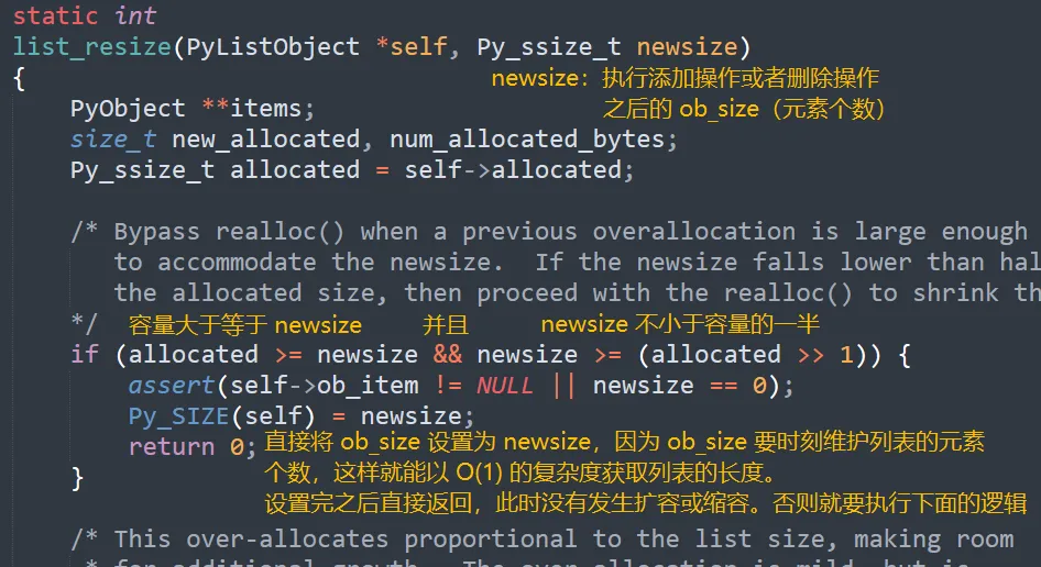 lst = [0] * 1000print(len(lst))print((lst.__sizeof__() - 40) // 8)"""10001000"""# 删除500个元素, 此时长度或者说ob_size就为500lst[500:] = []# 但是ob_size还是达到了容量的一半, 所以不会缩容print(len(lst))print((lst.__sizeof__() - 40) // 8)"""5001000"""# 如果再删除一个元素的话, 那么就要进行缩容了# 因为 ob_size 变成了 499, 小于 1000 // 2# 缩容之后容量怎么算呢? 还是之前那个公式print(499 + (499 >> 3) + (3if499 < 9else6))"""567"""# 测试一下, 删除一个元素# 看看会不会按照我们期待的规则进行缩容lst.pop()print(len(lst))print((lst.__sizeof__() - 40) // 8)"""499567"""一切都和我们想的是一样的,因为源码中就是这么写的。