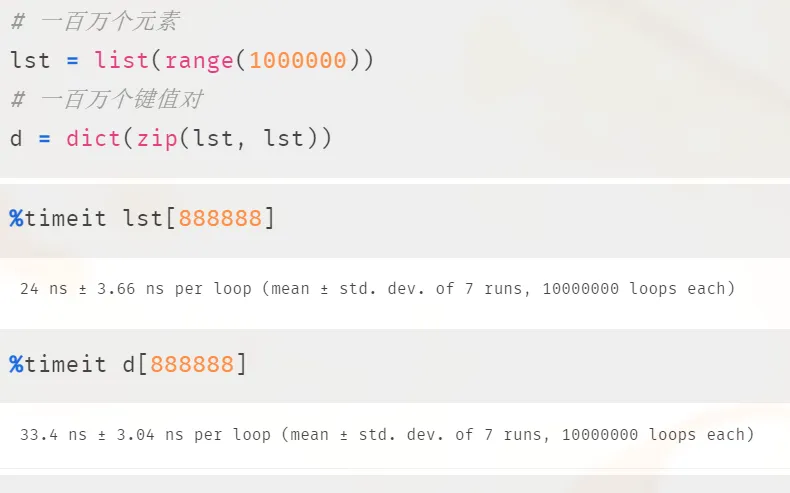 我们看到在查找元素时,列表比字典还要快那么一点点。因为这两者在 C 的层面都是基于数组实现的,只不过列表是直接基于索引获取,而字典则需要多一步对 key 进行映射的过程。当然这两者的效率都是极高的,复杂度都是 O(1)。