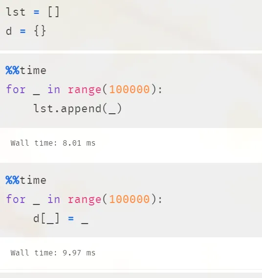 列表写入 100万个元素需要 8.01ms,而字典写入 100万个键值对需要 9.97ms。当然两者单次写入没有太大区别,毕竟复杂度都是 O(1)。但列表添加元素使用的要不是 append,而是 insert,那速度就会变慢,因为它的时间复杂度是 O(n)。