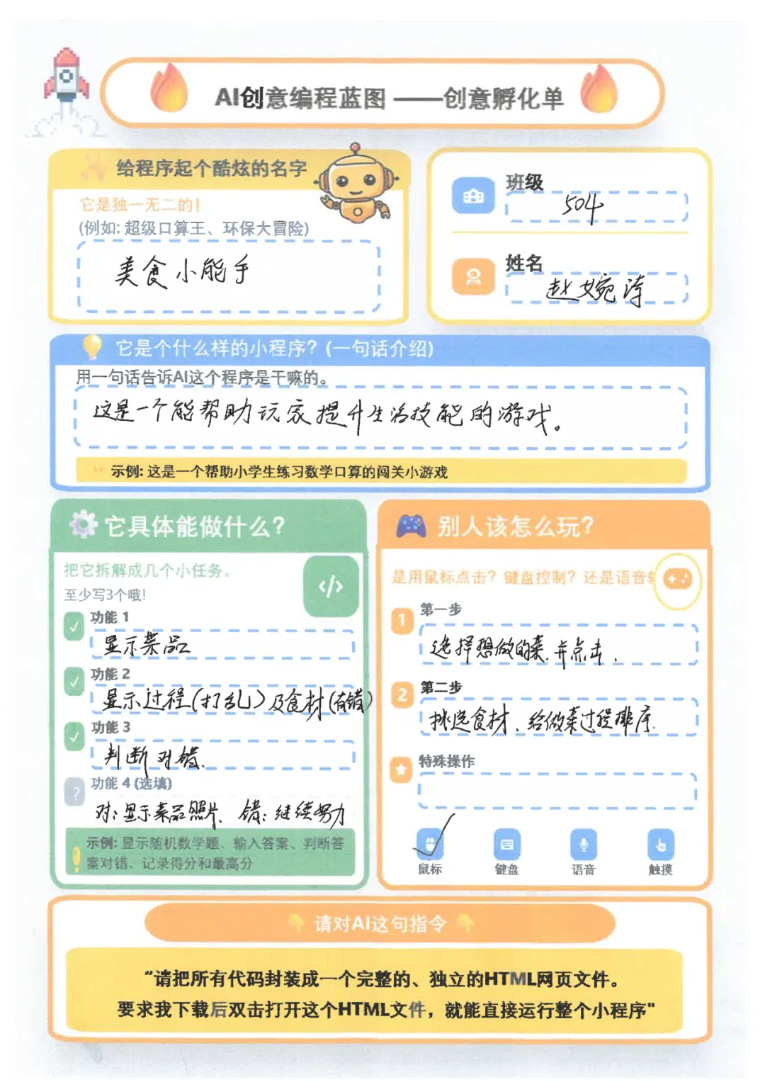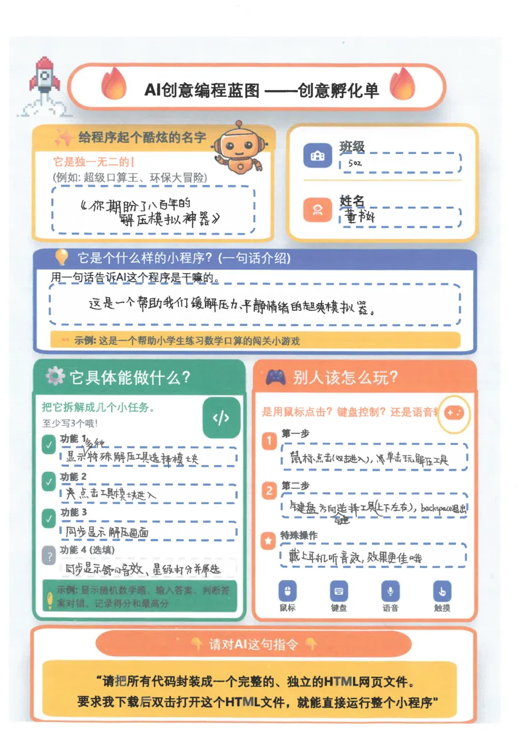 随后,孩子们化身“AI指令官”,认真下达清晰指令:“请把所有代码封装成完整独立的HTML网页文件,我下载后双击就能直接运行整个小程序!”