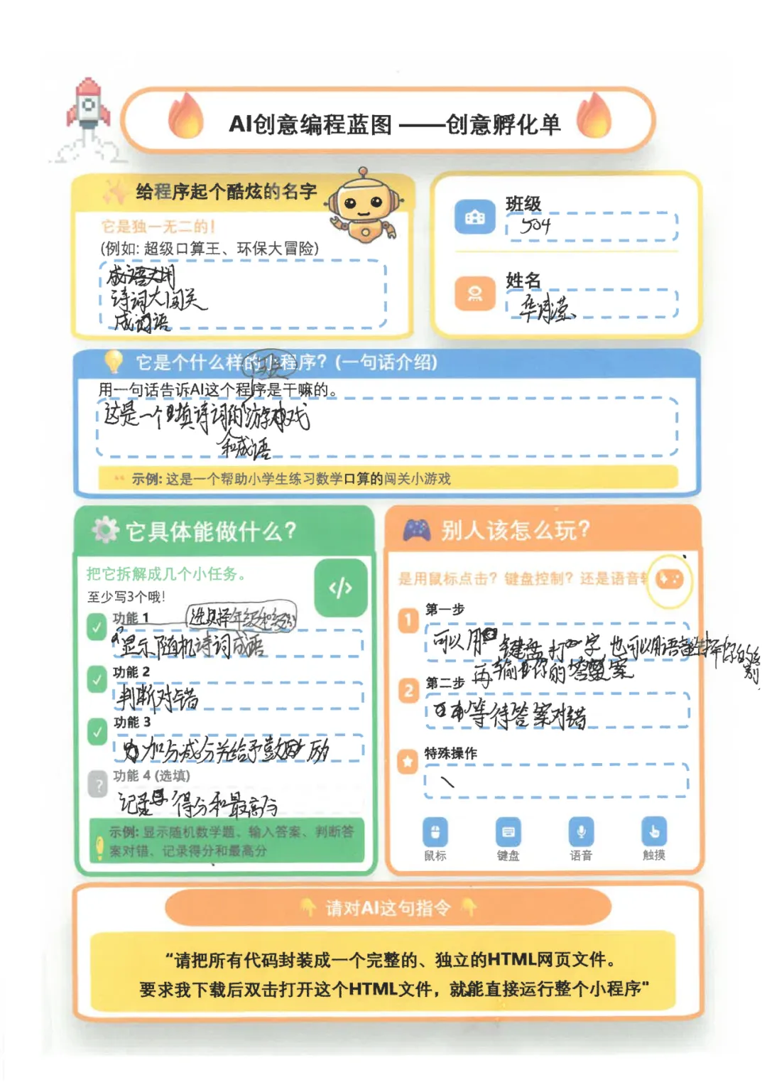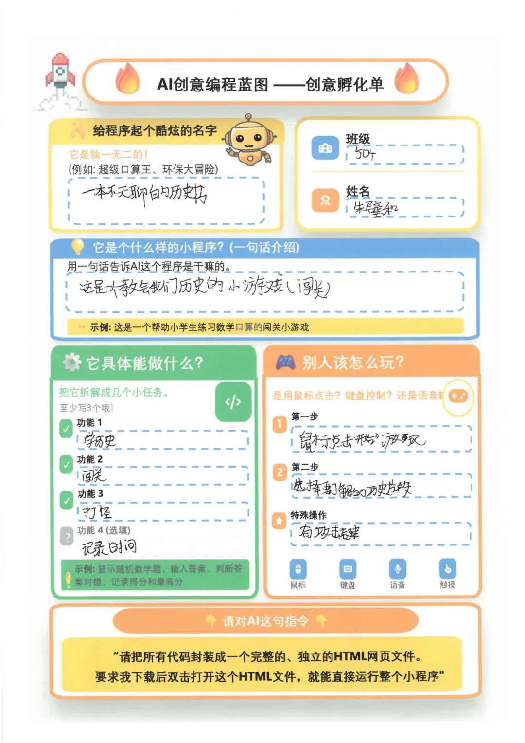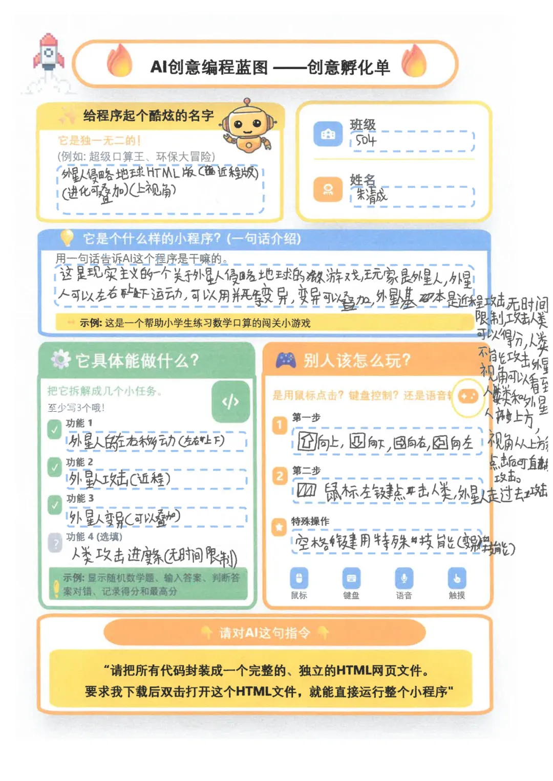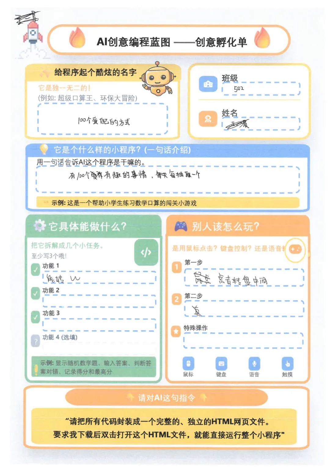 短短一周,少年们火力全开:敲定作品主题、搜罗各类素材、搭建项目框架,一笔一画勾勒出专属自己的“AI创意编程蓝图——创意孵化单”,每一处细节都藏着不被定义的奇思妙想。