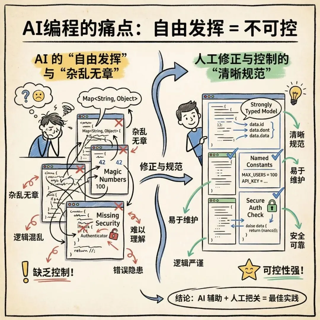 你是否也曾经历这样的场景:你兴致勃勃地对 AI 说:“嘿,帮我加个用户筛选功能!” 半小时后,它确实交出了一堆代码。但你定睛一看,头皮发麻——代码里充斥着各种“坏味道”:随处可见的 Map<String, Object>、意义不明的“魔术数字”、以及被忘在九霄云外的安全校验……