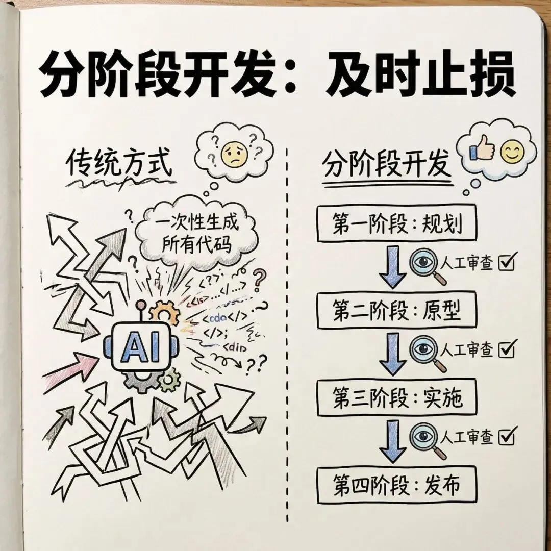 人工审查:在 AI 暂停时,由人类开发者进行快速审查,确认当前阶段的产出完全正确。