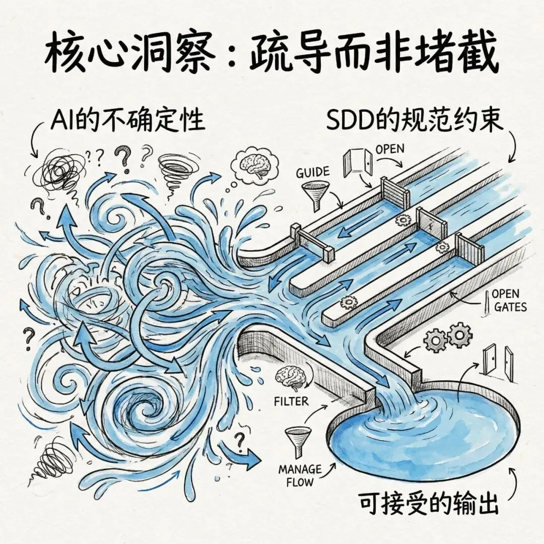 这就像水利工程,面对汹涌的洪水,最高效的方法不是筑高墙去“堵”,而是挖渠道去“疏导”。SDD 就是那套精密的渠道系统,它将 AI 随机的“概率输出”,最终引导汇聚为“确定的交付成果”。这是一种从“对抗 AI 随机性”到“驾驭 AI 随机性”的思维转变。