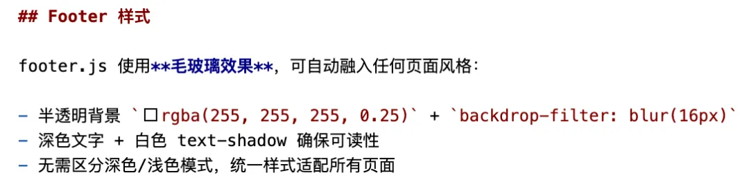 目前 Footer 使用毛玻璃样式,基本能够融入任何页面风格: