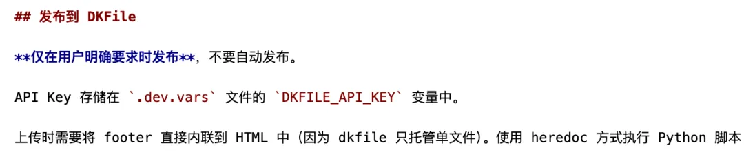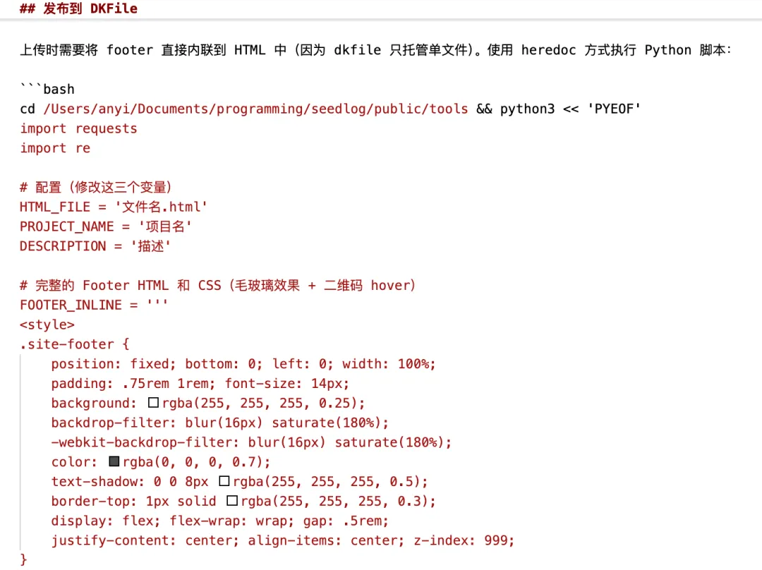 在优化 Footer 的时候,发现一个坑,就是文件上传到 cloudflare 没问题,因为页面和公共的 footer.js 是一起上传的,但是如果上传到 dkfile,因为 dkfile 是上传单个 HTML 页面,会导致 footer 丢失。解决方法时,每次上传 dkfile 的时候,都再注入一次 footer 信息: