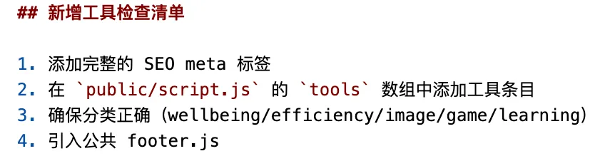 2. 增加了自动 SEO 功能,确保写网页的时候自动完成了 SEO 信息优化,同时增加了新增工具检查清单,这样工具写好,也不需要额外再去 script.js 添加入口,方便程度又进行了提升: